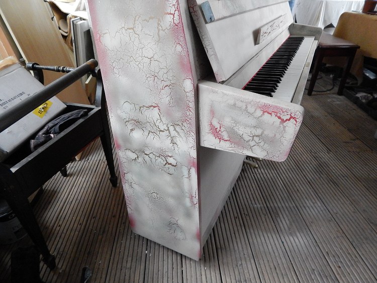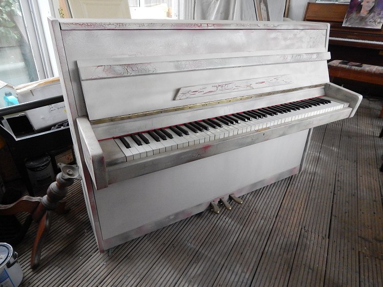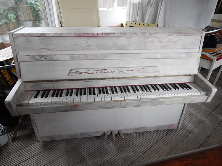 Shabby Chic Piano finished in Cream Crackle Finish with red and gold embelishments. £450 SOLD Free Local Delivery